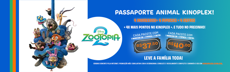 A oportunidade que você esperava para assistir ZOOTOPIA 2 com toda a família! Aproveite o Passaporte Animal para garantir a diversão completa: 4 ingressos + 4 combos + 4x mais pontos no Kinoplex+.